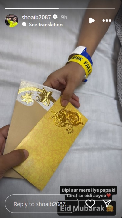 तस्वीर में दीपिका और शोएब के हाथों में लिफाफा नजर आ रहा था। वह बिस्तर पर लेटी हुई हैं जबकि शोएब उनके पास बैठे हैं। फोटो शेयर करते हुए शोएब ने लिखा,'दीपी और मेरे लिए पापा की तरफ से ईदी आई है। इसी के साथ उन्होंने लाल दिल वाला इमोजी बनाया और लिखा ईद मुबारक। शोएब लगातार वीडियो शेयर कर दीपिका की सेहत और परिवार के हालचाल के बारे में फैंस को अपडेट दे रहे हैं। हाल ही में शोएब ने अपने यूट्यूब चैनल पर सात मिनट का एक वीडियो शेयर किया जिसमें उन्होंने बताया कि दीपिका अस्पताल में ठीक हो रही हैं। उन्होंने फैंस को बताया कि सर्जरी सुबह शुरू हुई और आधी रात से ठीक पहले खत्म हो गई।
