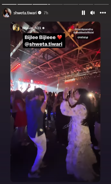 हार्डी संधू ने अपने कॉन्सर्ट में अपना फेमस गाना बिजली-बिजली भी गया, जिसपर श्वेता जमकर डांस किया। इस मौके पर एक्ट्रेस व्हाइट प्रिंटेड ड्रेस में नजर आई। बता दें, बिजली-बिजली गाना साल 2021 में रिलीज हुआ था। इस गाने में एक्ट्रेस की बेटी पलक तिवारी नजर आई थी।