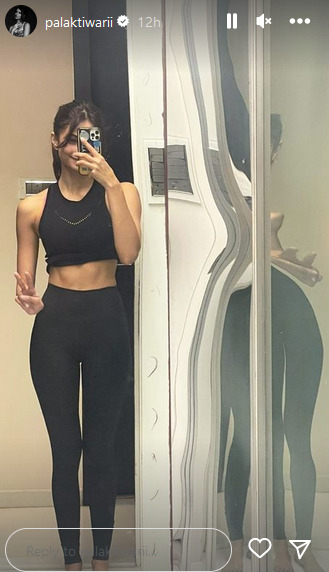 पलक तिवारी ने इंस्टाग्राम स्टोरी पर अपनी एक तस्वीर पोस्ट की है, जो उनकी मिरर सेल्फी है। इसमें आप देख सकते हैं कि पलक ने ब्लैक कलर का स्किन टाइट पैंट और क्रॉप टॉप पहना हुआ है। इस दौरान वो खुद मोबाइल से अपनी सेल्फी लेती दिख रही हैं। आप देख सकते हैं कि पलक ने अपने बालों को कवर कर रखा है। उनके इस लुक को देखकर ऐसा लग रहा है की वो शायद जिम में वर्कआउट करके आ रही हैं या फिर करने जा रही हैं। इस दौरान पलक का लुक फैंस को इंप्रेस करता दिख रहा है।