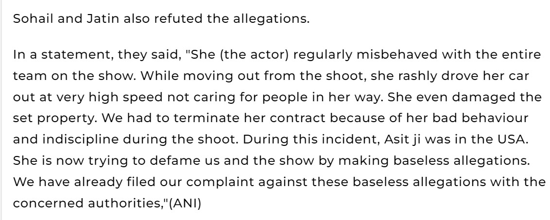 न्यूज एजेंसी एएनआई को दिए बयान में सोहेल रमानी और जतिन बजाज ने कहा, "वह (अभिनेत्री) सेट पर सभी के साथ बुरा बर्ताव करती थी। शूट से बाहर निकलने के बाद, वह बहुत हाई स्पीड में अपनी कार चलाती थी, और उसे परवाह नहीं होती थी अगर कोई भी उसके रास्ते में आ जाए। उसने सेट की प्रॉपर्टी का भी नुकसान किया। हमें उनके खराब रवैये की वजह से उसका कॉन्ट्रैक्ट टर्मिनेट करना पड़ा। हादसे के वक्त असित जी यूएसए में थे। अब वह इस तरह के आरोप लगाकर हमारी और शो की इमेज खराब करना चाह रही है। हमने पहले इस तरह के बेसलेस आरोपों के खिलाफ शिकायत दर्ज कराई है।''