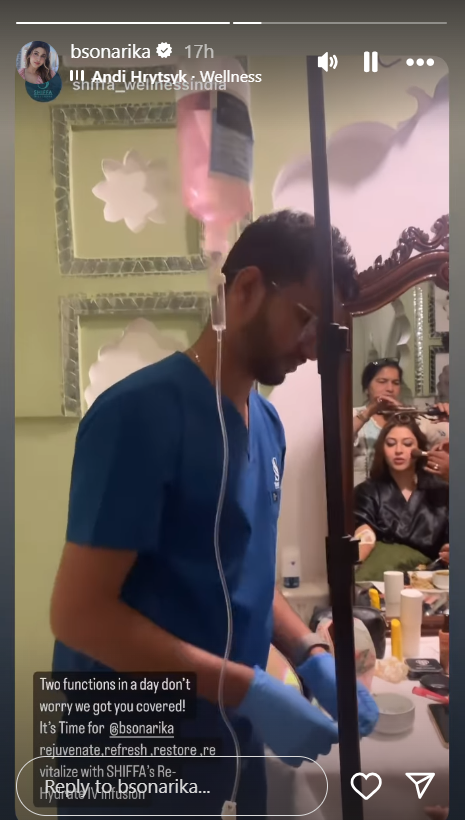 सोनारिका की शादी आज ही है। एक्ट्रेस रणथम्भौर में विकास पाराशर के साथ सात फेरे लेंगी। उनकी शादी के कार्यक्रम शनिवार से होटल नाहरगढ़ में शुरू हो गए हैं। इस बीच उन्होंने एक वीडियो शेयर किया, जिसे देखकर फैंस परेशान हो गए हैं। उन्होंने दिखाया है कि उनके हाथों में ड्रिप चढ़ी है।