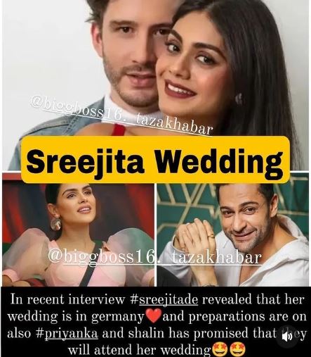 श्रीजिता डे ने अपने इंटरव्यू में ये बताया कि उनकी शादी में किन-किन बिग बॉस कंटेस्टेंट को उन्होंने इनवाइट किया है। एक्ट्रेस ने कहा कि प्रियंका चहर चौधरी और शालीन भनोट ने उनसे ये वादा किया है कि वह उनकी शादी को अटेंड करने के लिए जर्मनी आएंगे।