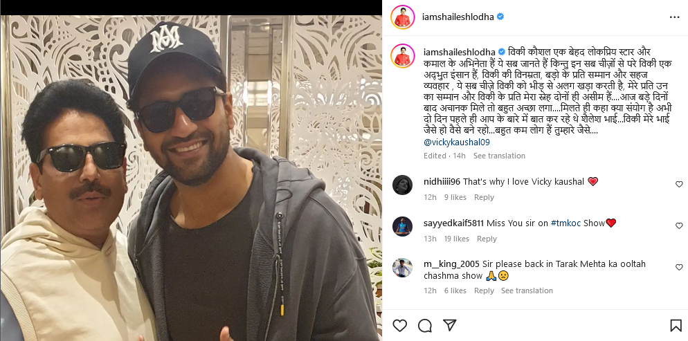 विक्की कौशल के साथ शैलेश लोढ़ा कर तस्वीर देखकर फैंस काफी खुश नजर आ रहे हैं। इस तस्वीर पर कमेंट कर यूजर्स लगातार शैलेश से एक ही सवाल कर रहे हैं कि वो तारक मेहता में कब वापसी करेंगे। इस पर कमेंट करते हुए एक यूजर ने लिखा, 'अरे मेहता साहब... हम आपका आदर करते है। बस एक ही इच्छा है की आप वापस आ जाएं।' वहीं एक ने लिखा, 'दो सेल्फ मेड सुपरस्टार!' एक ने लिखा, 'क्या आप फिल्मी दुनिया में कदम रख रहे हैं।'