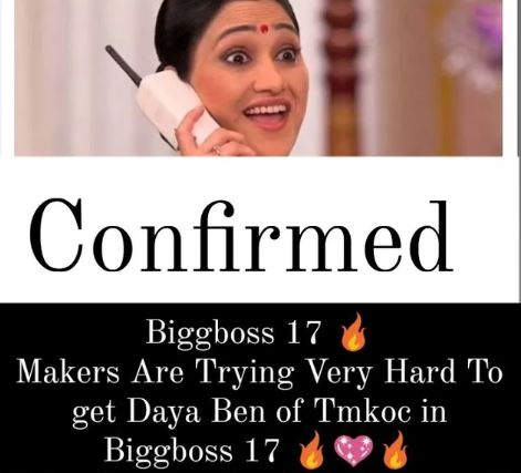 हाल ही में एक फैन क्लब ने अपने इंस्टाग्राम पर स्टोरी शेयर करते हुए बताया कि बिग बॉस 17 के मेकर्स 'तारक मेहता का उल्टा चश्मा' की दयाबेन को इस शो के लिए अप्रोच कर रहे हैं। हालांकि, दिशा वकानी की तरफ से सलमान खान के रियलिटी शो को लेकर अब तक कोई आधिकारिक बयान सामने नहीं आया है।