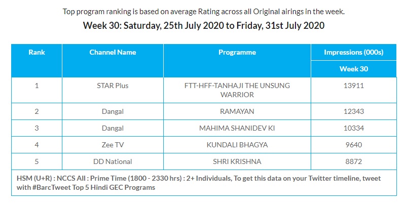 अगर लेटेस्ट टीआरपी रैंकिंग की बात करें तो पहले स्थान पर कोई शो नहीं है, बल्कि स्टार प्लस पर प्रसारित हुई अजय देवगन स्टारर फिल्म तान्हाजी: द अनसंग वॉरियर है। यानी लेटेस्ट टीआरपी रैंकिंग के हफ्ते में सबसे ज्यादा फिल्म को देखा गया है और वो सीरियल्स पर भी पड़ गई। उसके बाद दूसरे स्थान पर दंगल पर प्रसारित होने वाली रामायण है, तीसरे स्थान पर दंगल पर प्रसारित होने वाला महिमा शनिदेव की है, चौथे स्थान पर ज़ी टीवी पर प्रसारित होने वाला कुंडली भाग्य है। वहीं, पांचवें स्थान पर डीडी नेशनल का कार्यक्रम श्रीकृष्णा है।