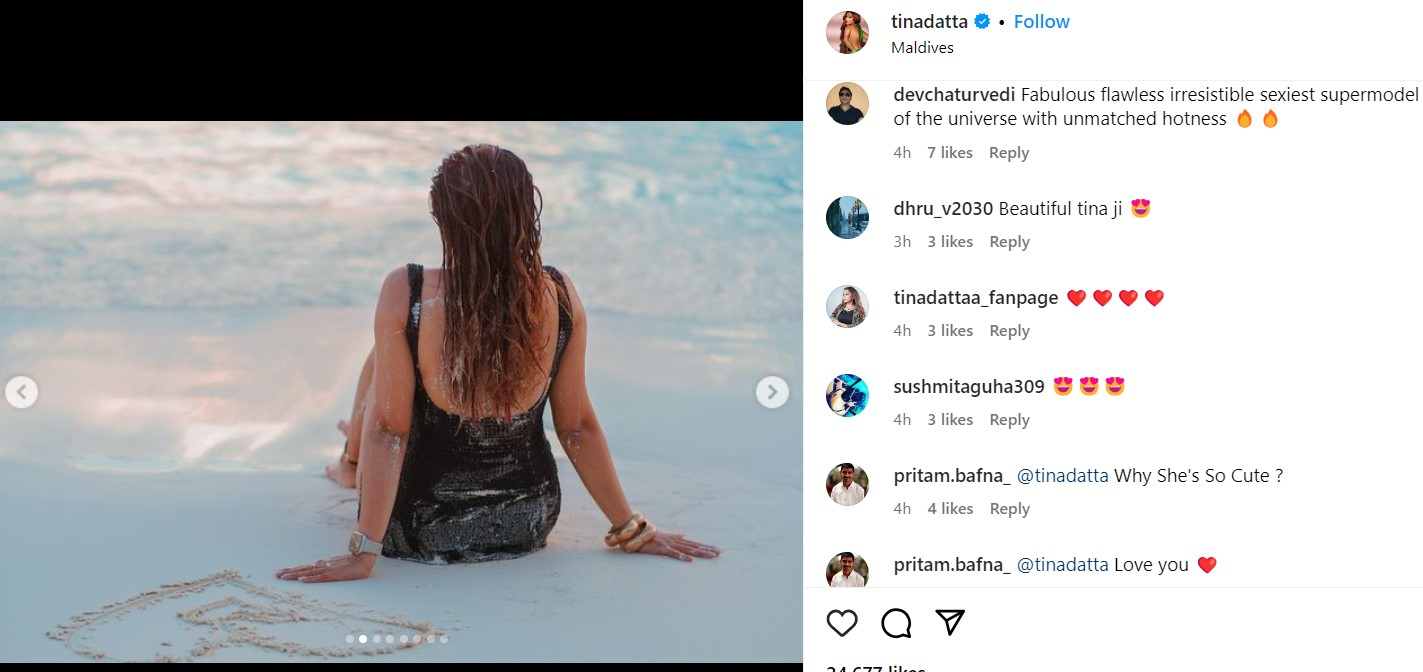 टेलीविजन एक्ट्रेस टीना दत्ता (Tina Datta) पर्सनल लाइफ से ज्यादा अक्सर प्रोफेशनल लाइफ के लिए सुर्खियां बटोरती रही हैं। बिग बॉस 16 के बाद उन्होंने जय भानुशाली के साथ हम रहें ना रहें हम सीरियल में काम किया। एक्ट्रेस ने हाल ही में बीच लाइड फोटोशूट की कुछ तस्वीरें शेयर की हैं जिसमें वह अपने हुस्न का जलवा दिखाती नजर आ रही हैं।