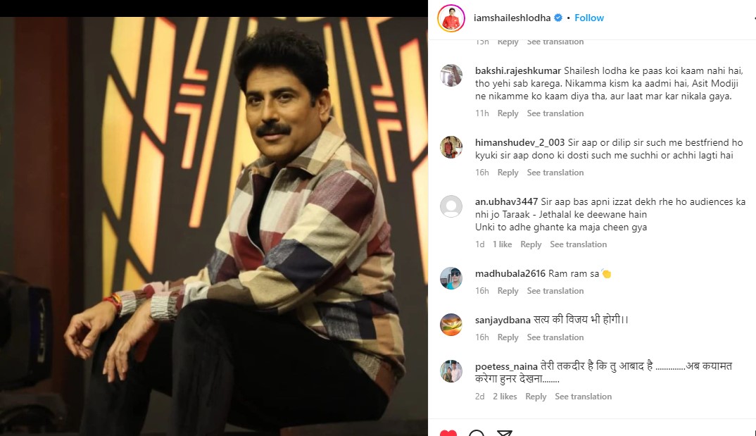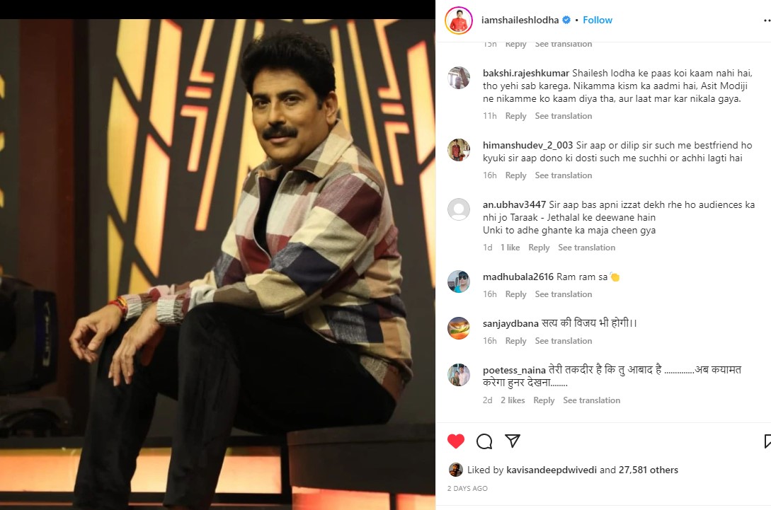 शैलेश लोढ़ा के फैंस आज भी तारक मेहता शो में उनकी वापसी की कामना करते हैं। इस पोस्ट के शेयर करते ही उनके कई फैंस ने शो में उन्हें वापस आने के लिए कहा। वहीं, कुछ फैंस ने इस जंग में उनकी जीत की कामना की। एक ने लिखा, 'सर असित जी के खिलाफ जंग किस प्रकार की होंगी।'