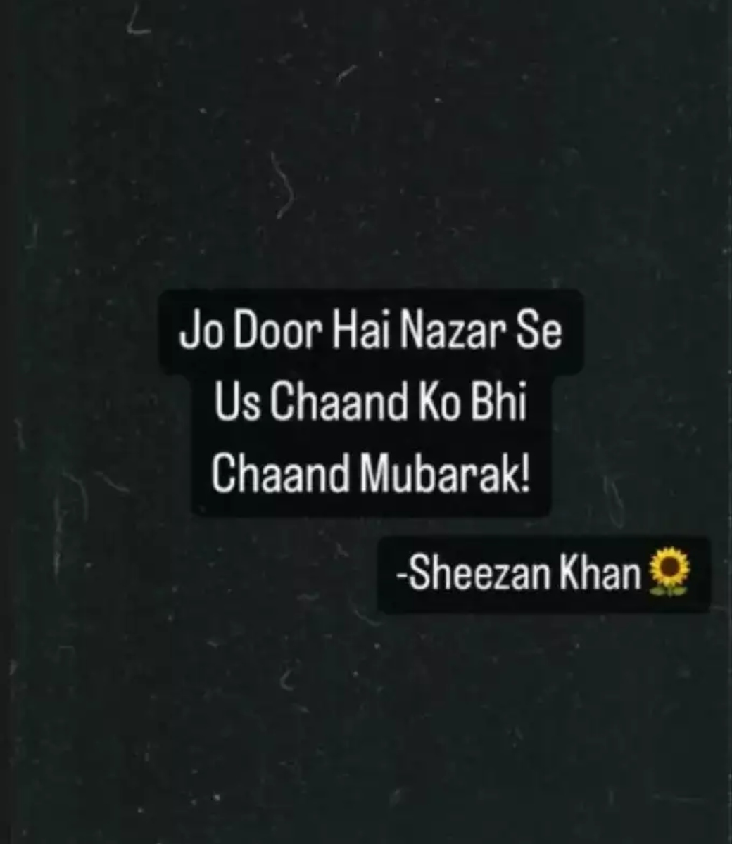 शीजान जब से घर वापस लौटे है वह इंस्टाग्राम पर एक्स गर्लफ्रेंड तुनिषा की याद में आए दिन कविताएं लिखते है। अब ईद के मौके पर एक्टर ने इंस्टाग्राम पर लिखा था, 'जो दूर है नजर से उस, उस चांद को भी चांद मुबारक- शीजान खान।' यहां उन्होंने तुनिषा को चांद कहा था।