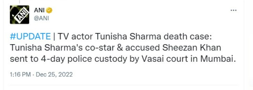 Tunisha Sharma Death: तुनिषा शर्मा मामले में बड़ा अपडेट, 4 दिन की पुलिस कस्टडी में भेजे गए शीजान खान