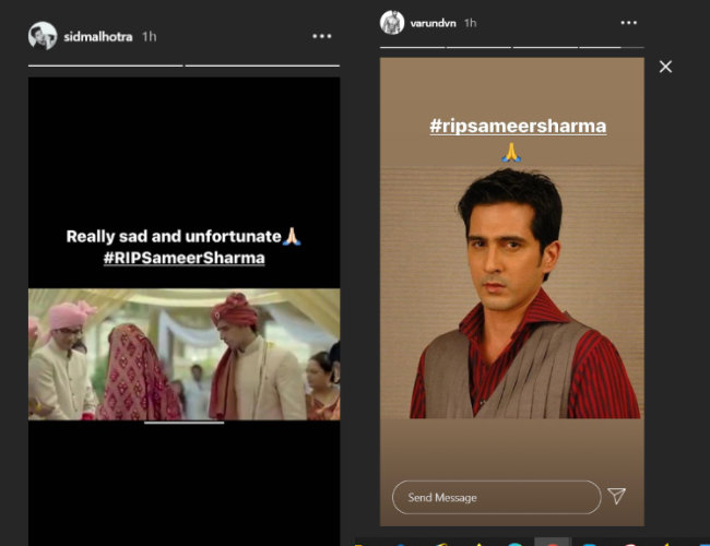 44 साल के समीर के निधन पर सिद्धार्थ मल्होत्रा और वरुण धवन ने अफ़सोस ज़ाहिर किया है। समीर ने सिद्धार्थ के साथ हंसी तो फंसी में काम किया था। फ़िल्मों में यह उनका डेब्यू था। सिद्धार्थ ने इंस्टा स्टोरी में लिखा- वाकई दुखद और दुर्भाग्यशाली है। वहीं वरुण धवन ने इंस्टा स्टोरी के ज़रिए समीर को श्रद्धांजलि दी।