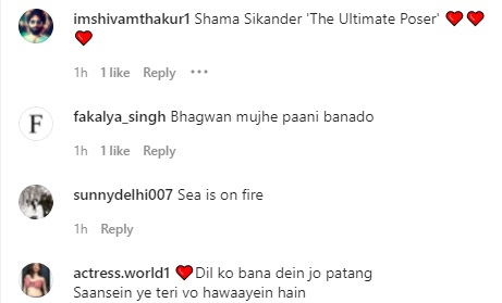 शमा सिकंदर के फैंस और तमाम सोशल मीडिया यूजर्स उनकी तस्वीर को खूब पसंद कर रहे हैं। साथ ही कमेंट कर अपनी प्रतिक्रिया दे रहे हैं। theshaikh_010 नाम के यूजर ने शमा सिकंदर की तस्वीर पर कमेंट कर लिखा, 'जल परी।' fakalya_singh ने लिखा है, 'हे भगवान मुझे पानी बना दो।' your.fan.viewer नाम के यूजर ने अपने कमेंट में लिखा, 'आग लग गई आज इंस्टाग्राम में।'