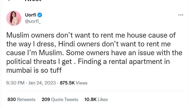 उर्फी जावेद को मुस्लिम लोग किराए पर घर नहीं दे रहे हैं