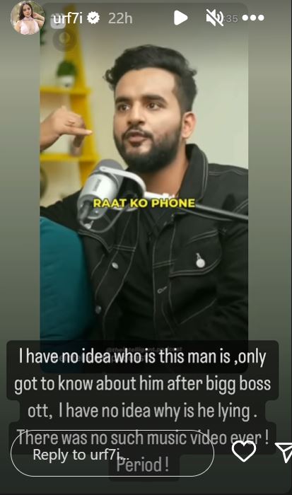 उर्फी जावेद ने अपनी इंस्टाग्राम स्टोरी पर एक वीडियो भी शेयर किया है। इसमें उन्होंने कहा, "आपकी इतनी भी वैल्यू नहीं है कि लोग आपको पैसे दें। फिर क्यों आपको इतनी शक्ति दे रहे हैं कि आप चुन लो कि आपके अपोजिट कौन होगा, लेकिन पैसे देने को तैयार नहीं हैं? मुझे इस म्यूजिक वीडियो के लिए किसी ने नहीं पूछा। मेरा इससे कोई ताल्लुक नहीं है।"