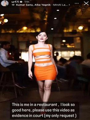 इसके साथ ही उर्फी जावेद ने इंस्टाग्राम स्टोरी पर एक बोल्ड वीडियो पोस्ट किया है। इस वीडियो में वो एक रेस्टोरेंट में नजर आ रही हैं। इस दौरान उनके लुक की बात करें तो उन्होंने नारंगी रंग की एक टाइट और शॉर्ट ड्रेस पहनी हुई है। उनकी इस ड्रेस में कई सारे कट्स लगे हुए हैं, जो उन्हें और भी बोल्ड बना रहा है। इस दौरान वो वॉक करती दिख रही हैं। वहीं वीडियो के साथ ही उर्फी ने लिखा, 'ये मैं हू एक रेस्टोरेंट में। इस वीडियो में मैं कितनी अच्छी लग रही हूं। प्लीज आप इस वीडियो को कोर्ट में एविडेंस के तौर पर इस्तेमाल करें (ये मेरी आपसे एकमात्र रिक्वेस्ट है)।' इस कैप्शन से साफ पता चल रहा है कि उर्फी जावेद किस तरह से भड़की हुई हैं।