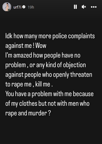 उर्फी जावेद के खिलाफ हाल ही में एक पुलिस कंप्लेंट फाइल हुई है, जिसके बाद एक्ट्रेस ने इस पूरे मामले पर रिएक्ट किया है। उर्फी ने अपनी इंस्टाग्राम स्टोरी पर एक पोस्ट शेयर किया है। इसमें उन्होंने लिखा, 'मुझे समझ नहीं आता मेरे खिलाफ और कितनी पुलिस पुलिस कंप्लेंट्स फाइल की जाएंगी! वाओ... मैं हैरान हूं ये देखकर कि किस तरह किसी को उन लोगों से कोई दिक्कत नहीं है जो खुलेआम मुझे मारने और मेरा दुष्कर्म करने की धमकी देते हैं। आपको मुझसे मेरे कपड़ों की वजह से दिक्कत है, लेकिन उन लोगों से नहीं है जो दुष्कर्म और मर्डर करते हैं?'