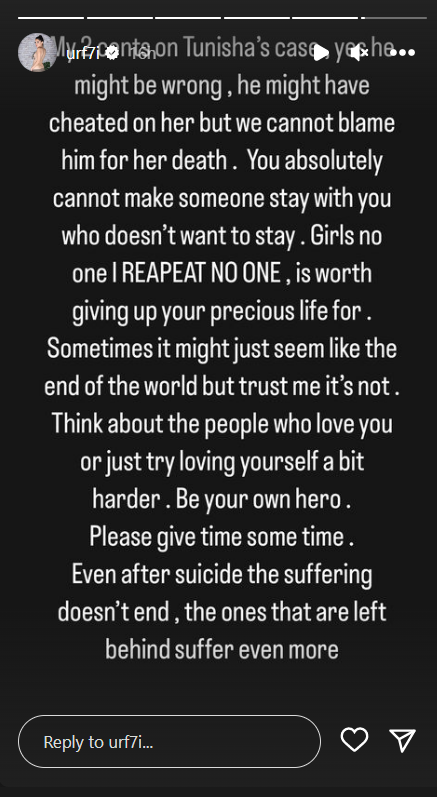 उर्फी ने अपने इंस्टाग्राम स्टोरी पर एक लंबा-चौथा पोस्ट लिखा है, जिसमे उन्होंने तुनिशा सुसाइड केस पर रिएक्ट किया है। उन्होंने लिखा हैं- हां, शीजान गलत हो सकता है, शायद उसने तुनिषा को धोखा दिया हो, लेकिन तुनिषा की मौत के लिए हम शीजान को जिम्मेदार नहीं ठहरा सकते... जब कोई आपके साथ नहीं रहना चाहता तो आप उसे जबरदस्ती अपने साथ रहने के लिए मजबूर नहीं कर सकते। गर्ल्स कोई भी नहीं, मैं फिर से कहती हूं कि कोई भी इस लायक नहीं होता कि आप उसके लिए अपनी जान दे दो। उन लोगों के बारे में सोचो जो आपको प्यार करते हैं और खुद से थोड़ा और प्यार करने की कोशिश करें। सुसाइड के बाद भी दर्द खत्म नहीं होता है, जिन्हें आप पीछे छोड़कर चले जाते हो वे सबसे ज्यादा दर्द झेलते हैं।