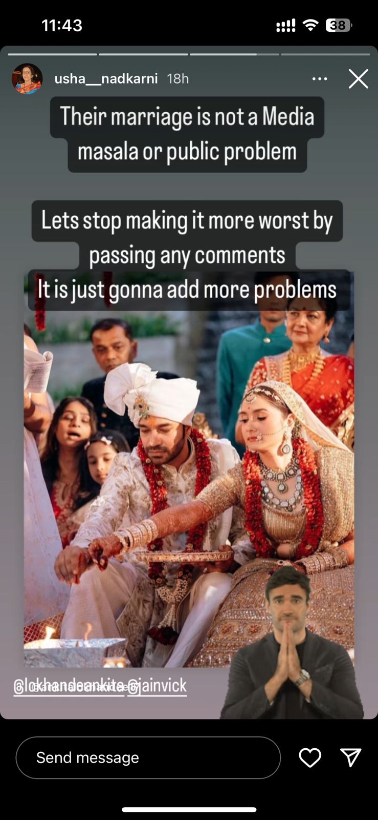 अंकिता लोखंडे ने सालों तक 'पवित्र रिश्ता' शो में काम किया है। इस शो में उनकी सास का किरदार उषा नाडकर्णी ने निभाया था। अब मीडिया में अंकिता और विक्की की पर्सनल लाइफ को लेकर कई तरह के सवाल-जवाब खड़े हो रहे हैं, जिसके चलते एक्ट्रेस ने अपने इंस्टाग्राम पर अंकिता की शादी की कुछ फोटो और वीडियो शेयर कर लिखा, इनकी शादी कोई मीडिया मसाला या पब्लिक प्रॉब्लम नहीं है। किसी भी तरह का कमेंट करके इसे और खबार मत करें क्योंकि इससे और दिक्कत हो सकती है।