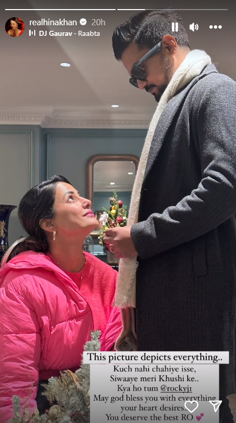 इसी बीच हिना ने अपनी इंस्टा स्टोरी पर रॉकी संग अपनी फोटो शेयर की है और कैप्शन में लिखा- ये फोटो सब कुछ कह रही है। इसे कुछ नहीं चाहिए सिवाय मेरी खुशी के, क्या हो तुम रॉकी, भगवान तुम्हें सब कुछ दे। इस फोटो में हिना और रॉकी एक-दूसरे की आंखों में खोए हुए नजर आ रहे हैं।