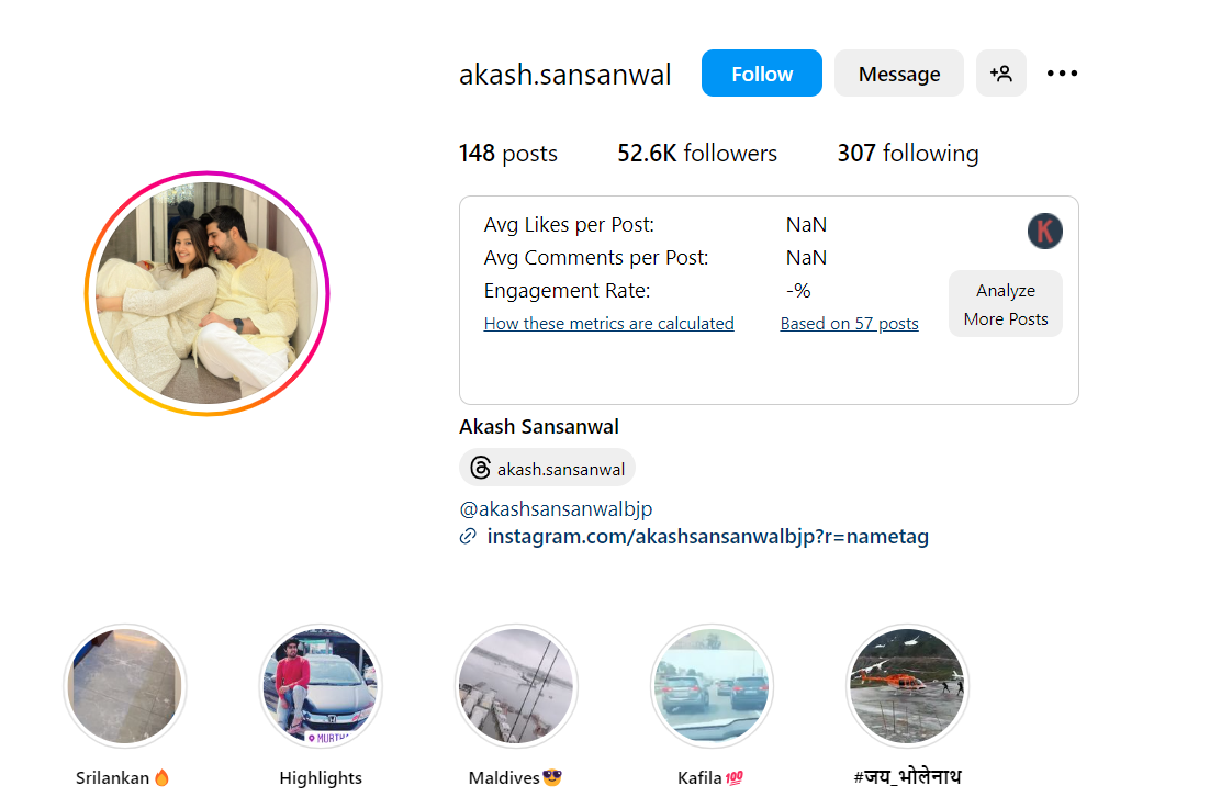 उन्होंने अधिकतर रील्स अंजलि अरोड़ा के साथ ही शेयर की हैं। वह 307 लोगों को फॉलो करते हैं, जिसमें एक्टर्स और क्रिकेटर्स शामिल हैं।