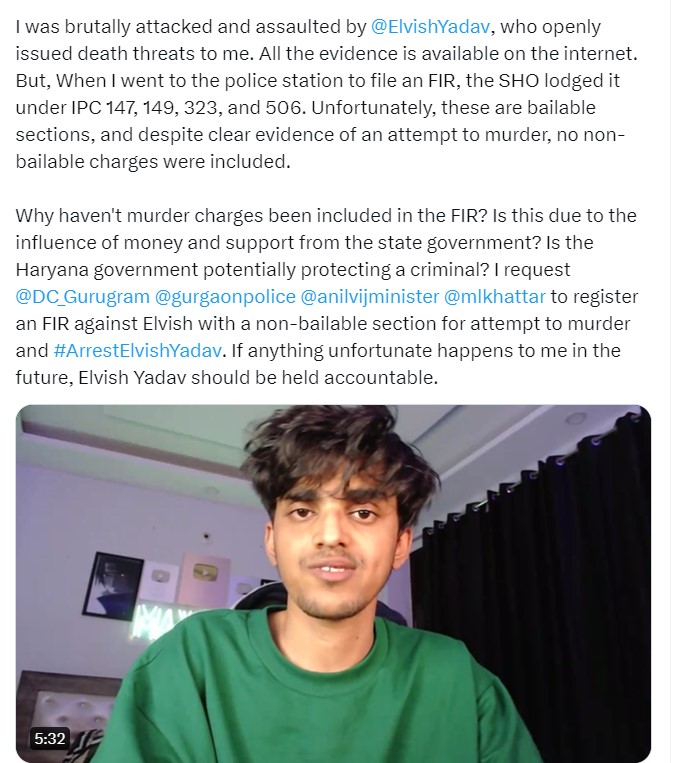 उन्होंने आने लिखा, 'एफआईआर में हत्या का आरोप क्यों नहीं शामिल किया गया? क्या यह राज्य सरकार के पैसे और समर्थन के प्रभाव के कारण है? क्या हरियाणा सरकार संभावित रूप से एक अपराधी को बचा रही है? मैं अनुरोध करता हूं @DC_Gurugram, @gurgaonpolice, @anilvijminister, @mlkhattar, @anilvijminister MS एल्विश के खिलाफ हत्या के प्रयास और #ArrestElvishYadav के लिए गैर-जमानती धारा के साथ एफआईआर दर्ज करने के लिए। अगर भविष्य में मेरे साथ कुछ भी दुर्भाग्यपूर्ण होता है, तो एल्विश यादव को जिम्मेदार ठहराया जाना चाहिए।'