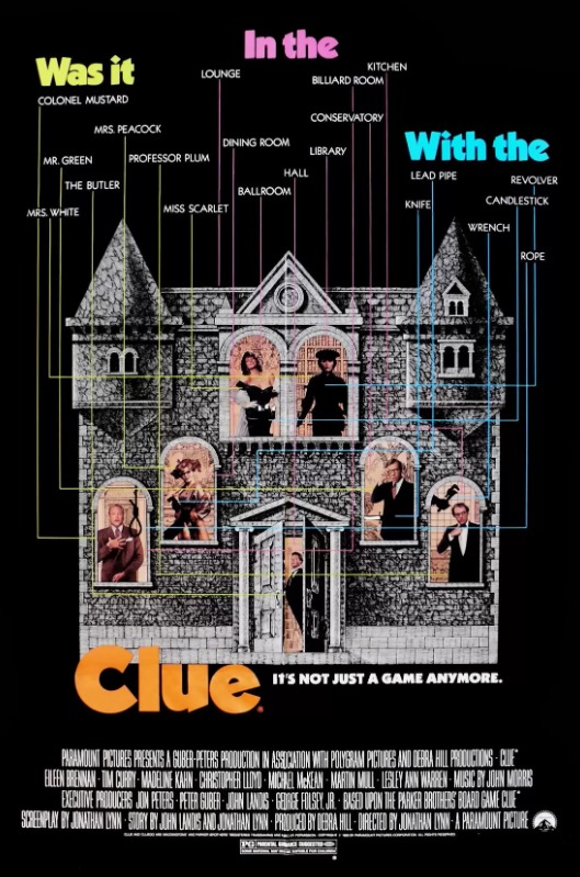 इसी नाम के एक लोकप्रिय बोर्ड गेम पर आधारित एक हॉलीवुड ब्लैक कॉमेडी मिस्ट्री थ्रिलर फिल्म आई थी। क्लू संभवतः इतिहास की पहली ऐसी फिल्म है जो एक या दो नहीं बल्कि तीन अलग-अलग अंत के साथ सिनेमाघरों में रिलीज हुई है। यह फिल्म एक घर में छह संदिग्धों और एक रहस्यमय हत्या के इर्द-गिर्द घूमती है। इसके तीन अंत में तीन अलग-अलग हत्यारे हैं। फिल्म साल 1985 में रिलीज हुई थी।