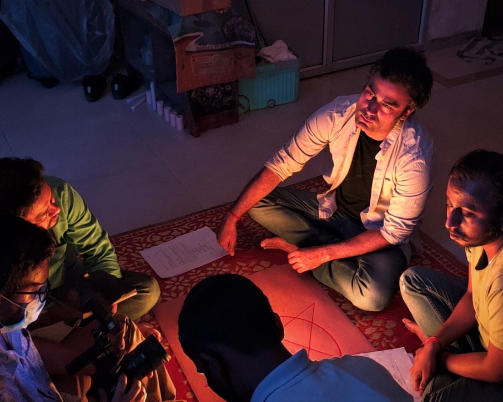 एक किरदार थोड़ा शरारती। वो भूत बुलाने के लिए उकसाता है। दूसरा वाला, जो सीधा है, वो मना करता है। ओखली में सिर क्यों देना। आख़िरकार, तीनों 'भूत बुलाने की किताब' के ज़रिए भूत को बुलाने की कोशिश करते हैं। हास्य का भाव पैदा करने के लिए संवादों का इस्तेमाल किया गया है। मसलन, मंत्र आदि में ऐसे शब्दों का प्रयोग किया है, ताकि हास्य का भाव पैदा हो सके। फिर कोई आता है और उनसे चाय पत्ती मांगता है। दोस्त मना करते हैं कि मत खोलो। जो शरारती दोस्त है, वो कहता है कि ऐसा कौन सा भूत है, जो दरवाज़ा खटखटाकर आता है। चिंता मत करो, यह कोई पड़ोसी होगा। फ़िल्म के क्लामैक्स में एक दिलचस्प मिस्ट्री है।''