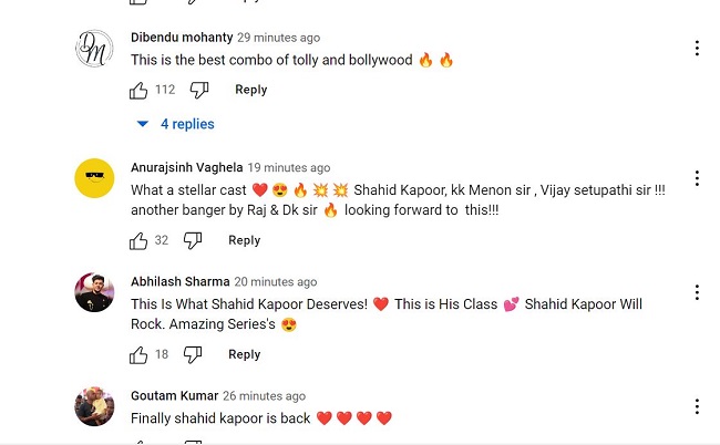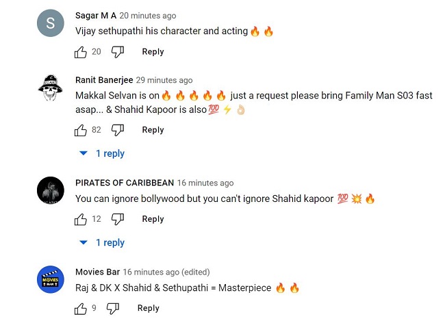 शाहिद कपूर और विजय सेतुपति के फैंस काफी खुश हैं। दोनों अपनी भूमिका में काफी दमदार एक्टिंग करते नजर आ रहे है। शो में जहां शाहिद कपूर ने एक ठग की भूमिका निभाई है। वहीं विजय सेतुपति एक अफसर की भूमिका में है। प्रोमो में कई अच्छे डायलॉग भी है जो कि फैंस को काफी पसंद आ रहे है। कई लोगों इसपर मीम भी बनाने लगे है।