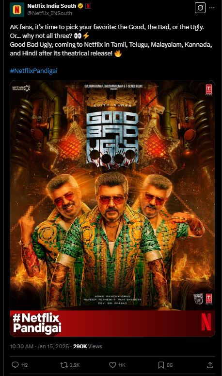 फिल्म गुड बैड अग्ली इस साल अप्रैल में रिलीज होने के लिए तैयार है जिसके बाद इसे नेटफ्लिक्स पर रिलीज किया जा सकता है। हाल ही में नेटफ्लिक्स के एक पेज ने ट्वीट करते हुए लिखा था, 'अजित कुमार के फैंस यह आपके पसंदीदा को चुनने का समय है: गुड, बैड या अगली। या... तीनों क्यों नहीं? गुड बैड अग्ली, सिनेमाघरों में रिलीज के बाद तमिल, तेलुगु, मलयालम, कन्नड़ और हिंदी में नेटफ्लिक्स पर आ रही है! हालांकि अभी तक इसकी तारीख सामने नहीं आई है मगर इस पोस्ट से ये माना जा सकता है कि मूवी नेटफ्लिक्स पर ही रिलीज होगी।