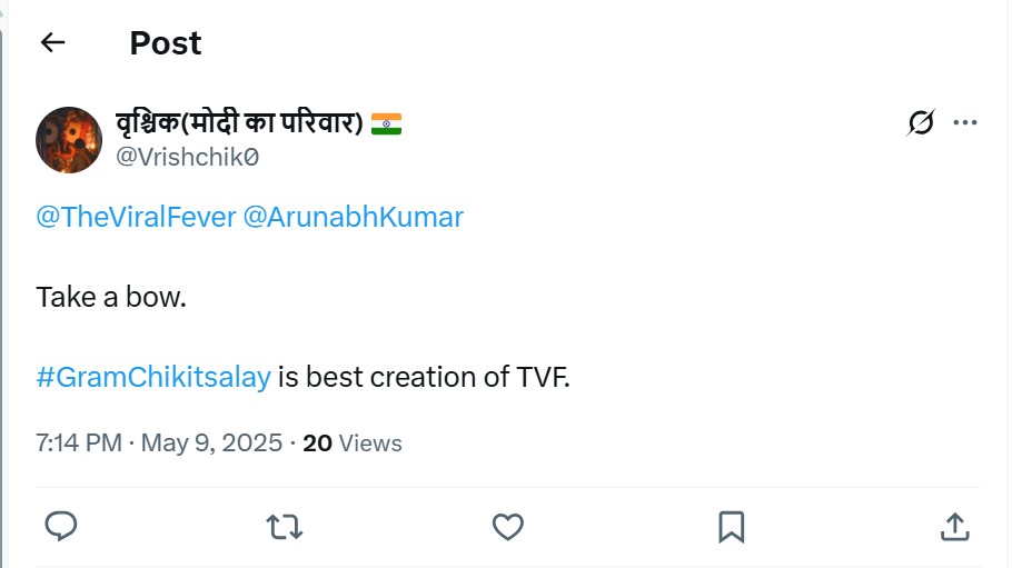 एक यूजर ने ट्वीट किया,"धन्यवाद। #GramChikitsalay TVF की सर्वश्रेष्ठ रचना है।"