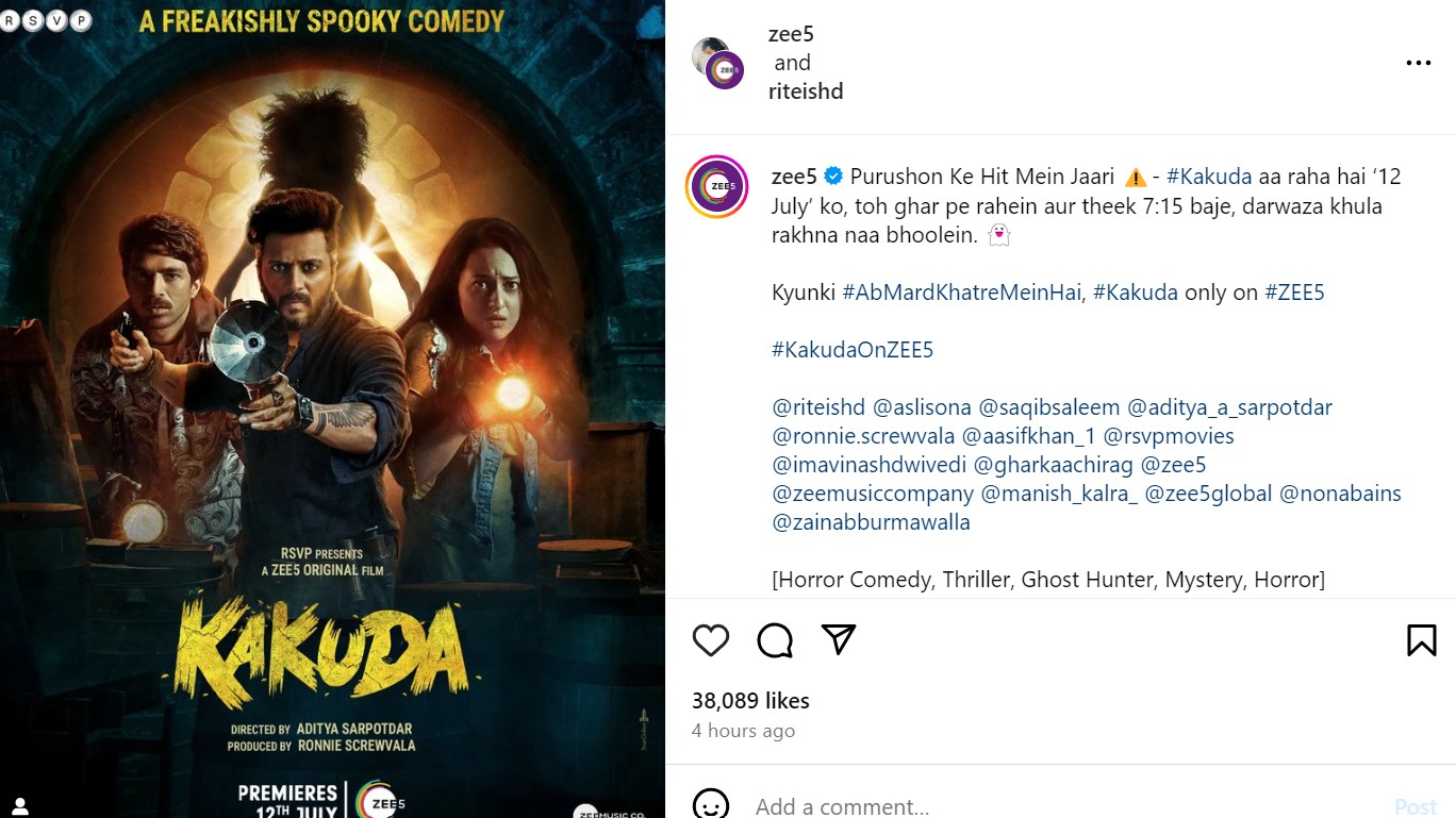आदित्य सरपोतदार के निर्देशन में बनी 'काकुडा' के निर्माता रॉनी स्क्रूवाला हैं। इस फिल्म में सोनाक्षी सिन्हा के साथ रितेश देशमुख, आसिफ खान और साकिब सलीम भी नजर आने वाले हैं। मेकर्स ने इसका पोस्टर भी शेयर किया है, जिसमें तीनों स्टार दिखाई दे रहे हैं। इसे शेयर करते हुए उन्होंने कैप्शन में लिखा कि पुरुषों के हित में जारी। ककुड़ा आ रहा है 12 जुलाई को, तो घर पे रहें और ठीक 7:15 बजे, दरवाजा खुला रखना ना भूलें। इसका मतलब है कि ये मूवी जी5 पर 12 जुलाई को स्ट्रीम होगी।