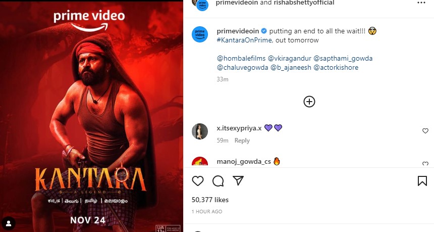 अमेजन प्राइम वीडियो में हाल ही में कांतारा के एक पोस्टर के साथ इस फिल्म की रिलीज डेट पर से पर्दा उठाया। अमेजन प्राइम वीडियो ने आधिकारिक इंस्टाग्राम पर ये बताया कि ये फिल्म 24 नवंबर को रिलीज हो रही है। पोस्टर के साथ उन्होंने कैप्शन में लिखा, 'आप सबका इंतजार अब खत्म हुआ। कांतारा प्राइम वीडियो पर कल रिलीज हो रही है। इस फिल्म को अभी सिर्फ चार भाषाओं तमिल, तेलुगु, मलयालम और कन्नड़ भाषा में रिलीज किया जाएगा। हालांकि, हिंदी भाषा में ये फिल्म कब ओटीटी प्लेटफॉर्म पर रिलीज की जाएगी इस पर अभी भी सस्पेंस बना हुआ है। इस जानकारी के सामने आने के बाद फैंस लगातार मेकर्स से ये सवाल कर रहे हैं कि वह इस फिल्म को हिंदी में कब रिलीज करेंगे।