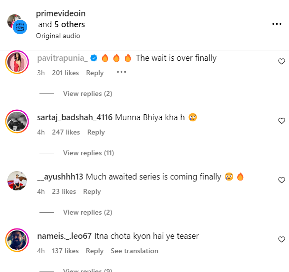 टीजर तो दर्शकों को काफी पसंद आ रहा है, लेकिन पिछले दो सीजन में नजर आए 'मुन्ना भैया' उर्फ दिव्येंदु शर्मा की कमी लोगों को मिर्जापुर 3 के नए सीजन में भी खटक रही है, जिसकी शिकायत वह मेकर्स से कमेंट बॉक्स में कर रहे हैं। इसके अलावा फैंस इस बात की शिकायत भी कर रहे हैं कि टीजर इतना छोटा सा क्यों हैं।