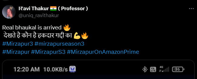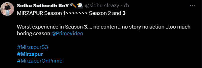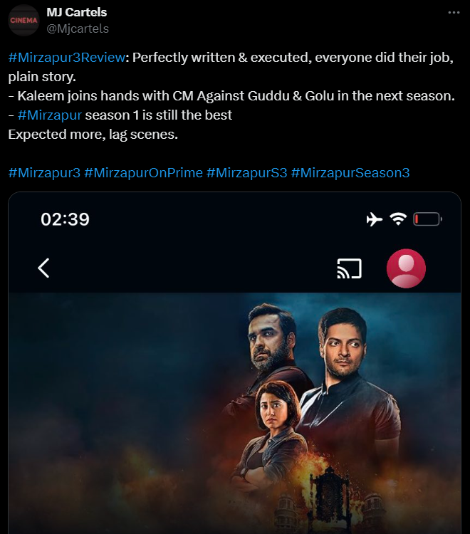 एक और फैन को मिर्जापुर का सीजन 3 काफी पसंद आ रहा है और उन्होंने लिखा," मिर्जापुर 3 का पहला एपिसोड, मिर्जापुर 1 का पुराना स्वैग लेकर लौटा है। इसमें ह्यूमर है, डायलॉगबाजी और सीन है। उम्मीद करते हैं कि ये मोमेंटम बना रहे। अली फजल ने बहुत ही बेहतरीन काम किया है"।