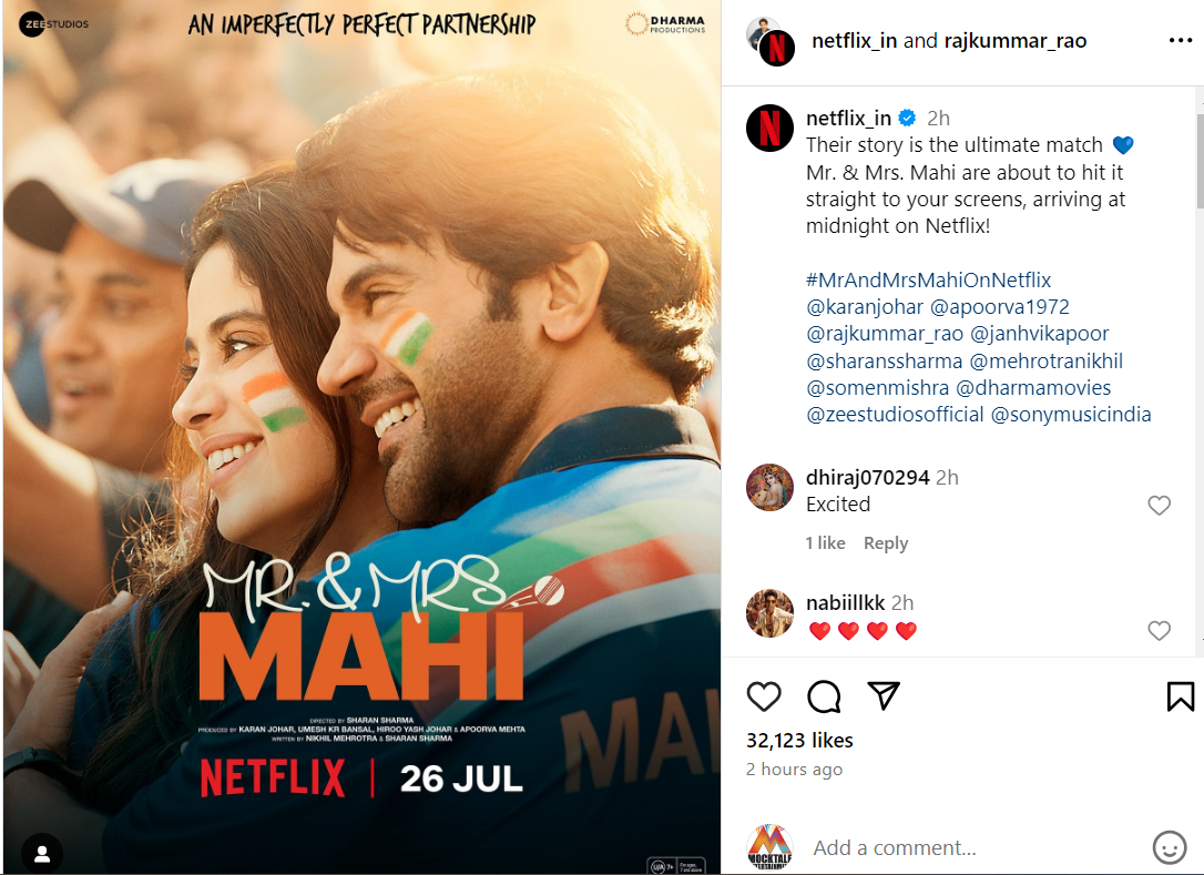 जाह्नवी और राजकुमार राव की फिल्म की ओटीटी रिलीज की घोषणा करने के साथ मेकर्स ने कैप्शन में लिखा,"ये स्टोरी एक अल्टीमेट मैच का है, मिस्टर एंड मिसेज माही मिडनाइट में सीधा आपकी स्क्रीन पर आ रही है। ये फिल्म रात के 12 बजे ओटीटी प्लेटफॉर्म पर स्ट्रीम की जाएगी।