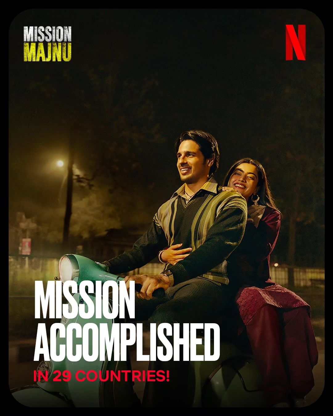 सिद्धार्थ मल्होत्रा की स्पाई थ्रिलर फिल्म 'मिशन मजनू' इस साल नेटफ्लिक्स पर रिलीज हुई। इस मूवी में सिद्धार्थ के साथ एक्ट्रेस रश्मिका मंदाना लीड रोल में दिखीं। इस सूची में ये फिल्म छठे पायदान पर है और इतना ही नहीं 29 देशों में ये फिल्म टॉप 10 फिल्मों की लिस्ट में शुमार है।