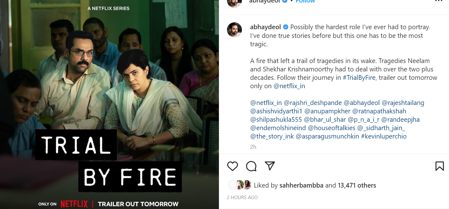 नई दिल्ली, जेएनएन। नेटफ्लिक्स पर 13 जनवरी को ट्रायल बाई फायर वेब सीरीज स्ट्रीम की जा रही है। इस सीरीज की कहानी दिल्ली के उपहार सिनेमाहाल में लगी आग के बाद चले लम्बे ट्रायल पर आधारित है। अभय देओल और राजश्री देशपांडे सीरीज में मुख्य भूमिकाएं निभा रहे हैं। कहानी इन्हीं दोनों किरदारों के नजरिए से आगे बढ़ेगी। अभय ने मंगलवार को सीरीज का फर्स्ट लुक शेयर करके इस किरदार को अपने करियर का सबसे मुश्किल रोल करार दिया।