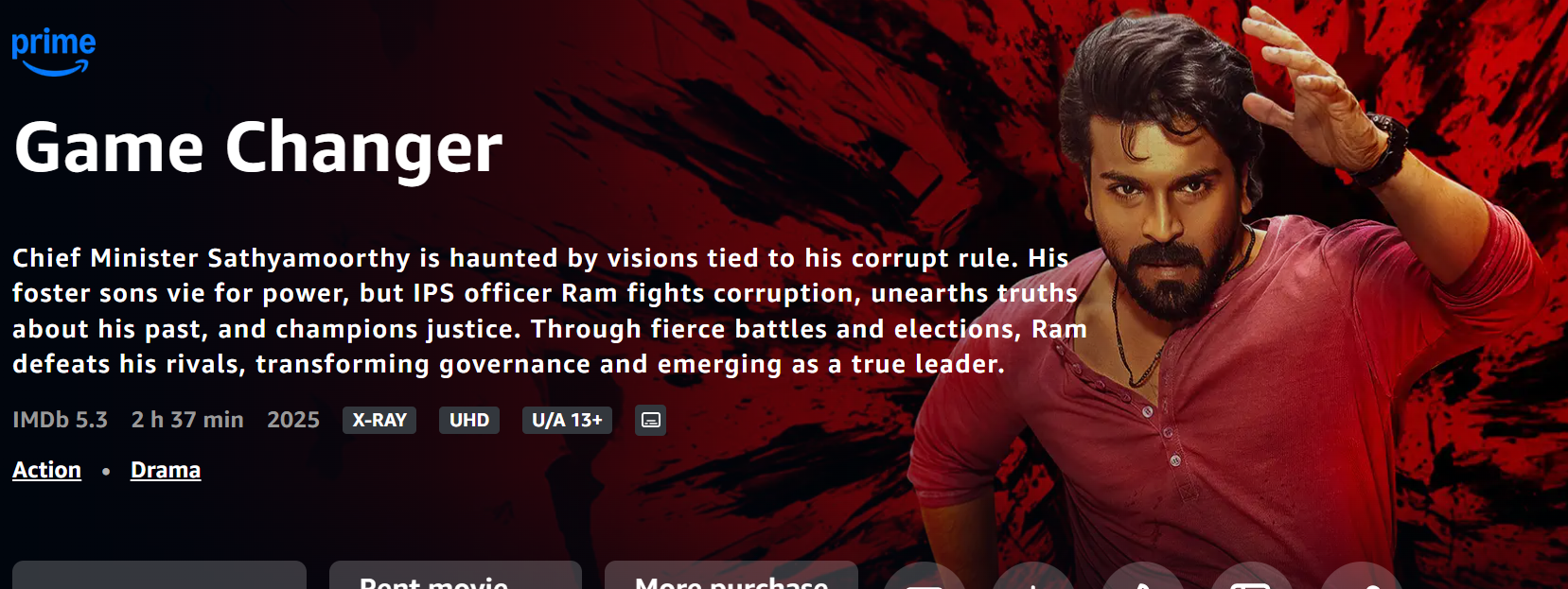 RRR की सफलता को देखते हुए मेकर्स ने 10 जनवरी 2025 को 'गेम चेंजर' (why the movie failed at the box office) को ओवरऑल इंडिया में रिलीज किया था, लेकिन फिल्म का भट्टा बैठ गया। जिसके एक महीने बाद 7 फरवरी को मेकर्स ने इसे ओटीटी प्लेटफॉर्म प्राइम वीडियो (Amazon Prime Video) पर रिलीज किया था, जिस पर आते ही फिल्म ने धमाल मचाया था। तीन महीने पहले रिलीज हुई ये फिल्म एक बार फिर से ओटीटी (Is Game Changer released in Ott) पर टॉप 10 ट्रेंडिंग फिल्मों में से एक है।