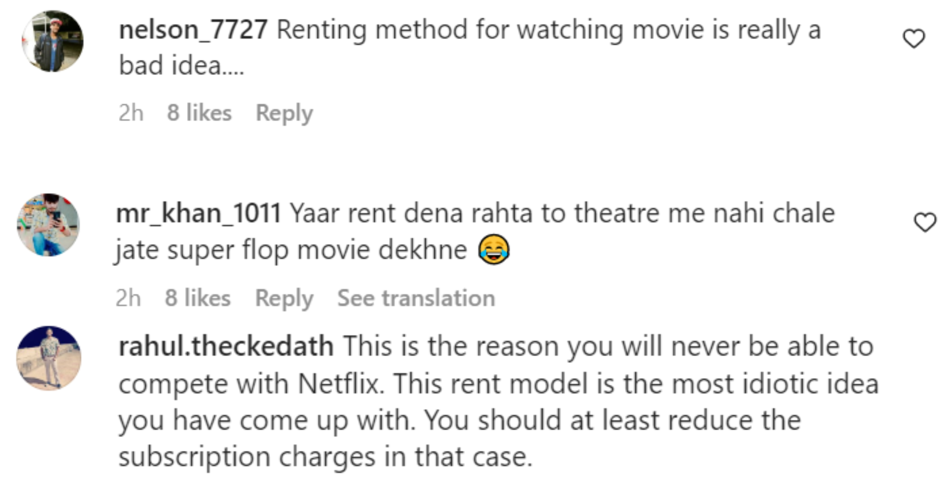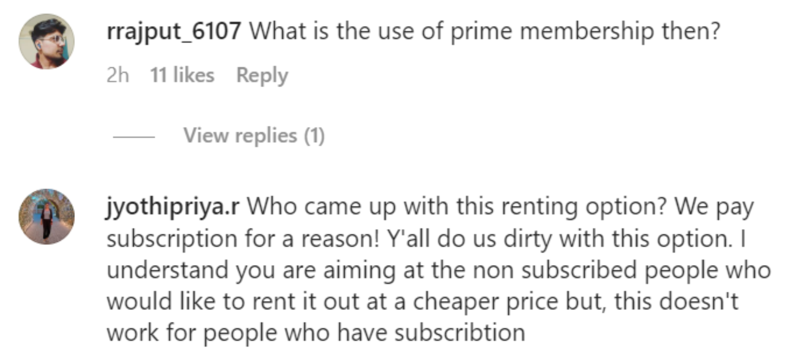 इस बार भी कई यूजर्स ने प्राइम वीडियो के इंस्टाग्राम पर जाकर पूछा है कि जब सब्सक्रिप्शन ले रखा है तो भी रेंटल में फिल्म उपलब्ध करवाने का क्या मतलब है? वहीं, एक अन्य यूजर ने लिखा- फिर हमारे सब्सक्रिप्शन लेने का क्या औचित्य है। कोई वजह है कि हम सब्सक्रिपशन लेते हैं। जिन लोगों के पास सब्सक्रिप्शन नहीं है, उनके लिए रेंटल रखा जाता है, मगर जिन लोगों के पास सब्सक्रिप्शन है, उनके लिए यह सही नहीं है।