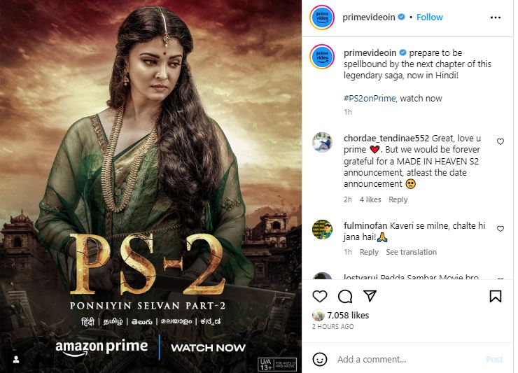 मणि रत्नम के निर्देशन में चोल साम्राज्य पर बनी पीएस-2 बीते महीने अमेजन प्राइम वीडियो पर मेकर्स ने रिलीज की थी। इस फिल्म को हिंदी के अलावा अन्य सभी तमिल, तेलुगु, मलयालम और कन्नड़ भाषा में रिलीज किया गया था, जबकि लोगों को हिंदी में इस ऐतिहासिक फिल्म को देखने की उत्सुकता थी।