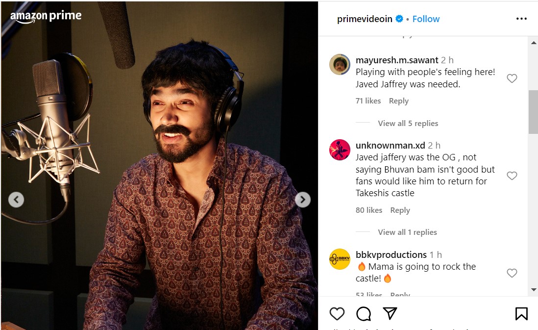 'ताकेशी कैसल' में जावेद जाफरी की जगह भुवन बाम को लेना कुछ फैंस को पसंद नहीं आय रहा है। प्राइम वीडियो के पोस्ट पर कमेंट करते हुए एक यूजर ने कहा, "लोगों की भावनाओं से खिलवाड़ किया जा रहा है। जावेद जाफरी को वापस लाओ।"