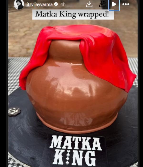विजय वर्मा ने इंस्टाग्राम पोस्ट के जरिए जानकारी दी कि मटका किंग की शूटिंग पूरी हो गई है। इंस्टाग्राम स्टोरी पर एक्टर ने मटका किंग (Matka King) की शूटिंग पूरी होने के सेलिब्रेशन की झलक दिखाई है। उन्होंने एक खास केक की तस्वीर शेयर की। दरअसल यह मटके जैसा बना हुआ है और पहली नजर में तो यह असली मटका लग रहा है। ध्यान से देखने पर पता लगता है कि यह एक केक है।