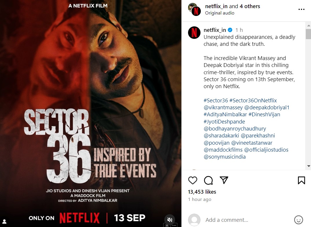 वहीं, मूवी का निर्देशन आदित्य निंबालकर ने किया है। यह फिल्म ओटीटी प्लेटफॉर्म नेटफ्लिक्स पर ही 13 सितंबर को दस्तक देने वाली है। फिल्म का पोस्ट शेयर करते हुए इसके कैप्शन में लिखा गया है कि अस्पष्टीकृत गायबियां, एक घातक पीछा और काला सच। अविश्वसनीय विक्रांत मैसी और दीपक डोबरियाल इस खौफनाक क्राइम-थ्रिलर में अभिनय करते हैं, जो सच्ची घटनाओं से प्रेरित है।