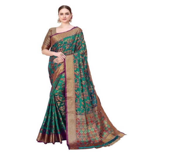इस Kanchipuram Silk Saree को आप शादी, पार्टी, रिसेप्शन, हल्दी समारोह जैसे हर अवसर पर पहन सकती हैं। इसका ग्रीन कलर शादी-ब्याह के लिए परफेक्ट च्वॉइस है। EthnicJunction Kanjivaram Saree For Women Price: Rs 399.