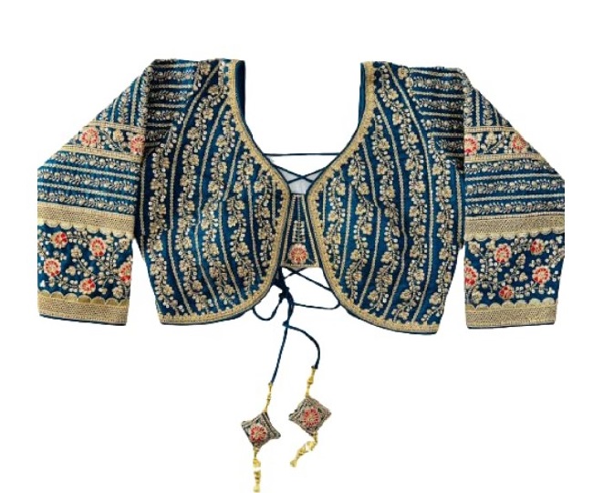 इस Latest Designer Blouse की नैक का डिज़ाइन बोट हैं और स्लीव कोहनी तक है। रेगुलर फिट में आने वाला यह ब्लाउज बहुत ही अच्छी फिटिंग देता है। Studio Shringaar Designer Blouse Price: Rs 569.