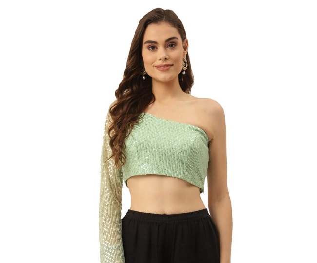 ऑफ शोल्डर डिज़ाइन वाला यह Saree Blouse Design पैडेड है। इस पर सीक्वेंस वर्क किया हुआ है, जो आपकी खूबसूरती में चार चांद लगाने का काम करेगा। Niharikaa Women's Designer Blouse Price: Rs 1800.