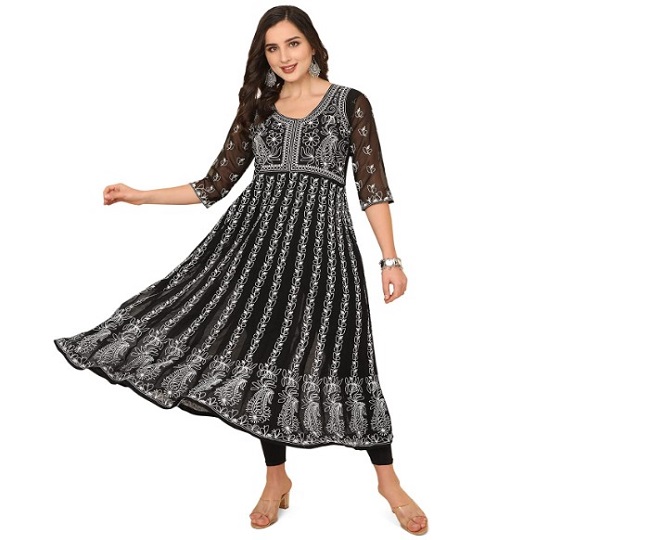 ब्लैक कलर का यह चिकनकारी एम्ब्रॉयडरी कुर्ता बहुत ही सुंदर है। इसमें आपको अनारकली पैटर्न मिलता है, जो रेगुलर फिट में आता है। इस Kurti For Women पर बहुत ही सुंदर फ्लोरल एम्ब्रॉयडरी की हुई है।