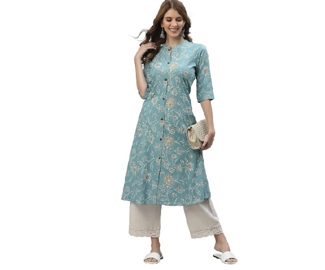 यह ब्लू कलर के अलावा और भी कलर ऑप्शन में मौजूद है। इसकी ¾ स्लीव है और राउंड नैक है। स्ट्रेट पैटर्न में आने वाला यह कुर्ता काफी आरामदायक है। Amayra Kurti For Women Price: Rs 429.