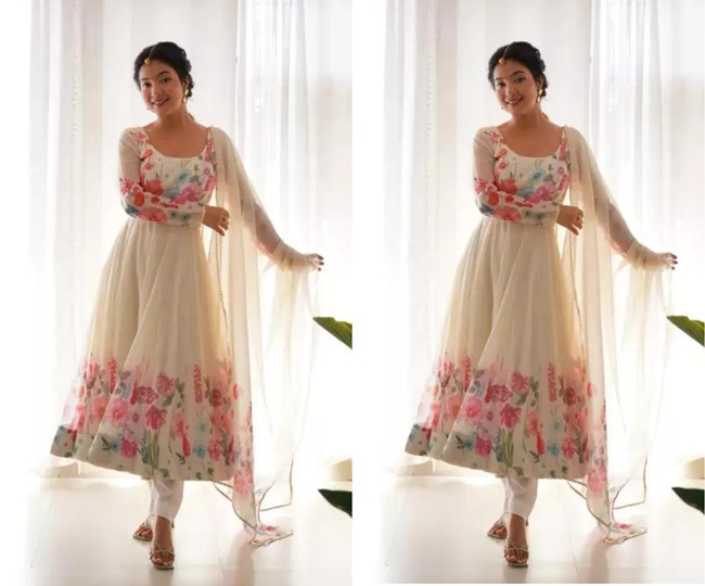 सफ़ेद कढ़ाई वाला योक प्योर मुलायम ऑर्गेना अनारकली सूट काफी यूनिक और लेटेस्ट ट्रेंड के अनुसार काफी ज्यादा चल रहा है। इस सूट के बाजू पर, नेक के एरिया पर और बॉर्डर पर फ्लोरल प्रिटिंग की गई है, जो सूट को इंहैंस लुक देती है।