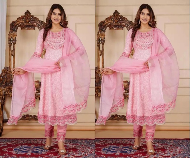 पिंक कलर महिलाओं का पसंदीदा कलर माना जाता है। किसी फंक्शन और ऑकेजन के लिए इसका चुनाव परफेक्ट है। इसका डिजाइन नेक, बॉर्डर और बाजू पर किया गया है। अनारकली सूट में प्रिटिंग और स्टोन का काम भी देखने को मिलेगा।