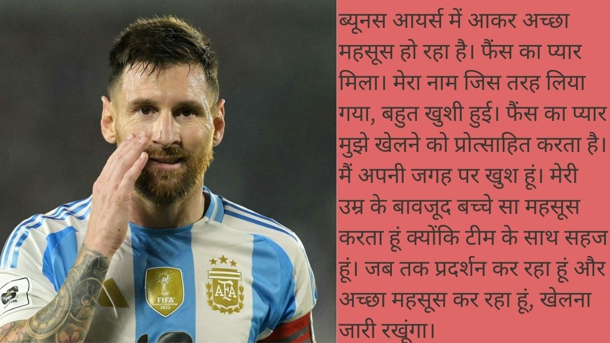 लियोनेल मेसी ने मैच के बाद कहा कि उन्हें ब्यूनस आयर्स में लौटकर अच्छा महसूस हुआ। उन्हें यहां फैंस के प्यार का एहसास मिला, जो उन्हें खेलने के लिए प्रोत्साहित कर रहा है। अर्जेंटीनी स्ट्राइकर ने कहा कि उन्हें टीम में बच्चे की तरह महसूस हो रहा है क्योंकि वो साथियों के साथ सहज हैं।